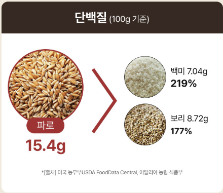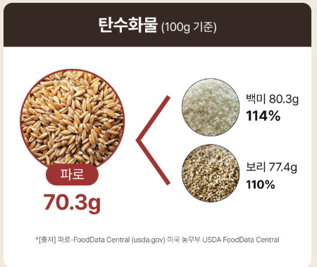 파로는 일반 곡물보다 단백질과 섬유질이 풍부하고, 탄수화물과 당 함량이 낮아 '착한 탄수화물'로 불립니다. 또한 18종의 아미노산, 9종의 미네랄, 6종의 비타민을 함유하고 있어 영양학적으로도 우수한 곡물로 평가받고 있습니다.