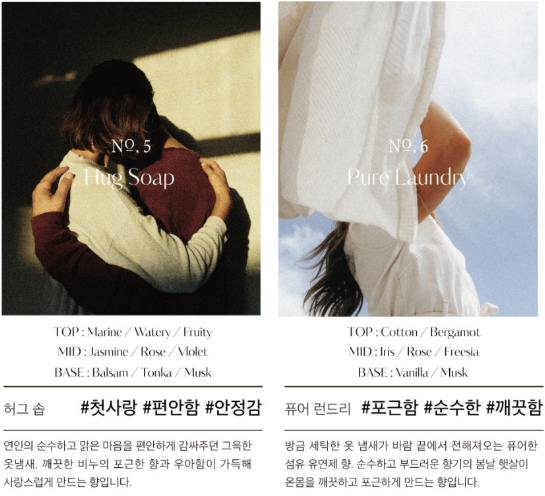 - 화이트 셔츠: 섬세한 섬유유연제 느낌의 향기로, 깔끔한 이미지의 공간에 제격입니다.