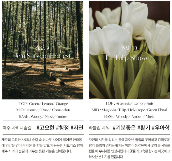 - 제주 사려니숲길: 제주의 청정 자연을 닮은 시원한 숲속 향기로 힐링 무드를 선사합니다.