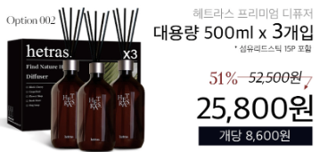 헤트라스 프리미엄 디퓨저는 향기, 디자인, 지속력 모두에서 만족할 수 있는 제품입니다. 무심코 지나치는 공간에도 향기 하나로 분위기가 완전히 바뀌는 것을 느껴보세요. 감성적이고 실용적인 홈 퍼퓸을 찾고 있다면, 지금 바로 헤트라스를 경험해보세요.