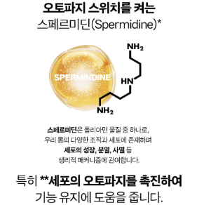 효모에서 유래한 스페르미딘은 식물성 원료를 기반으로 하여, 자연스럽게 체내 흡수가 용이하도록 설계되었습니다. 연구에 따르면, 스페르미딘은 세포의 자가포식(Autophagy)을 활성화하여 손상된 세포를 제거하고 새로운 세포 생성을 촉진하는 효과가 있는 것으로 알려져 있습니다.
